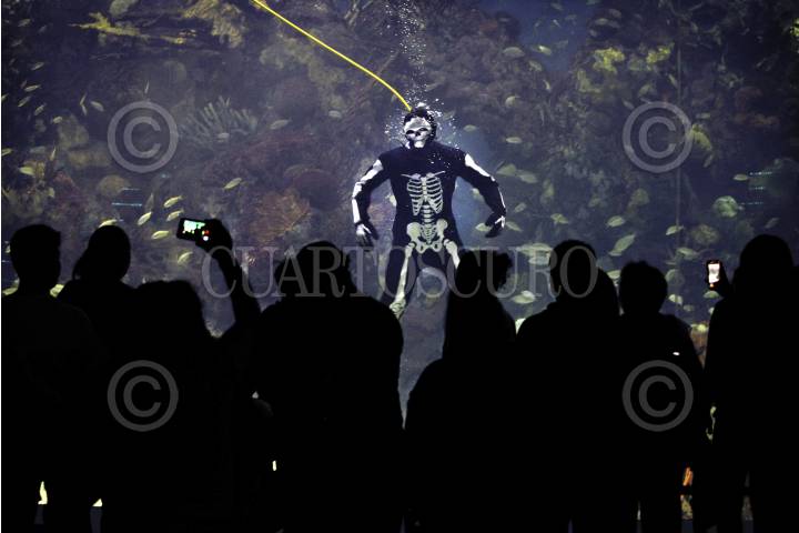 VERACRUZ, VERACRUZ, 02NOVIEMBRE2012.- En el acuario de Veracruz se realizó la inmersión de un buzo disfrazado de calaca en la Gran Pecera Arrecifal, esto como parte de la celebración del Día de Muertos, que sirve como un atractivo más para los visitantes. FOTO: FÉLIX MÁRQUEZ /CUARTOSCURO.COM