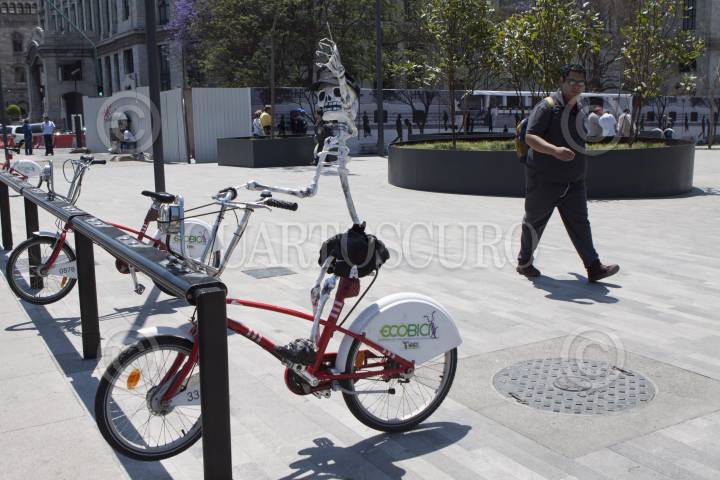 MÉXICO, D.F., 03MARZO2013.- Una calaca de cartón fue colocada en un estación de Ecobici, ubicada en la Alameda Central, esto para concientizar a los automovilistas sobre la convivencia y el respeto que debe haber entre coches, bicicletas y peatones. FOTO: MOISÉS PABLO /CUARTOSCURO.COM