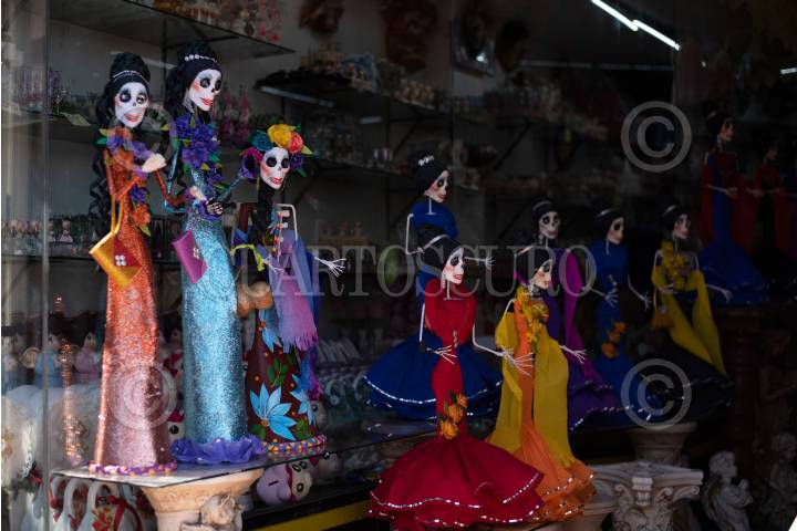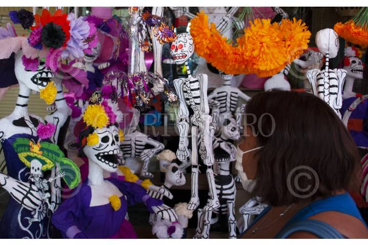 Una mujer observa las figuras de catrinas que se encuentran en venta.