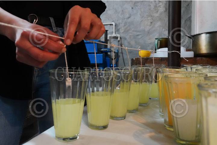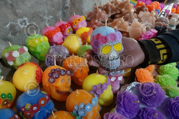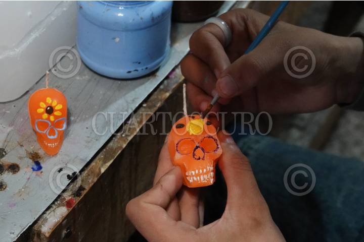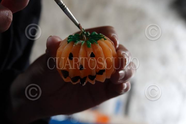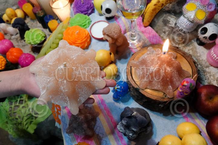 El Colectivo Grupo Heredia Flores elaboran veladoras aromáticas con figuras de pan de muerto, flores de cempasúchil, calabazas y calaveritas para celebración del Día de Muertos en la alcaldía Xochimilco