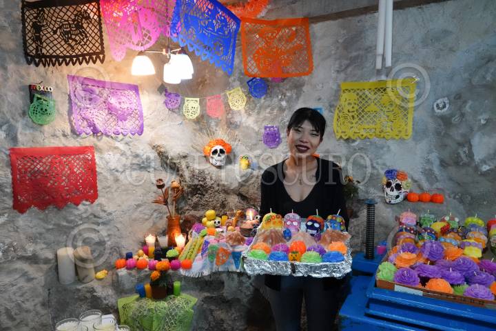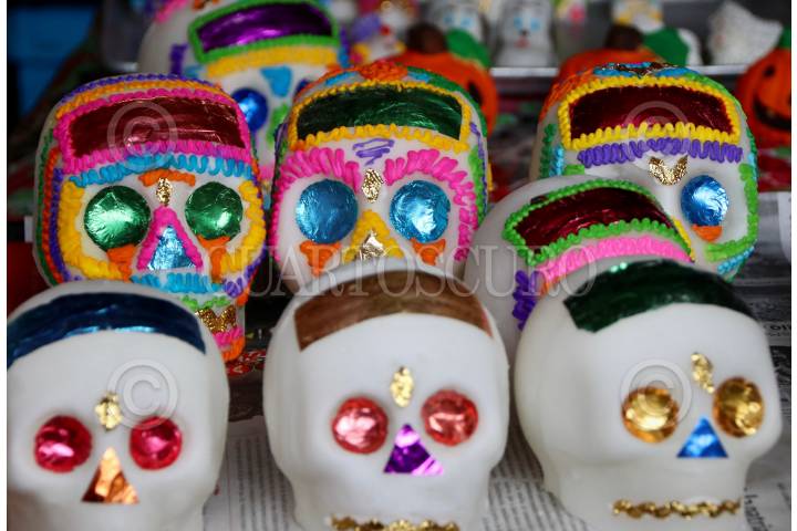 Decoración de calaveritas de amaranto para el festejo de Día de Muertos, en la alcaldía Xochimilco