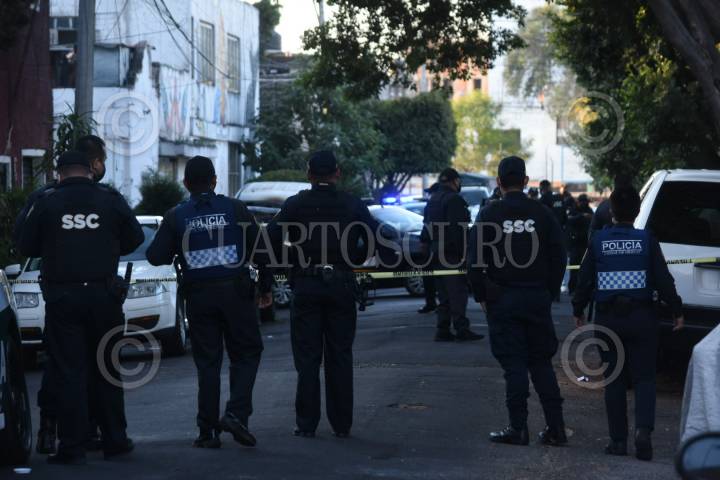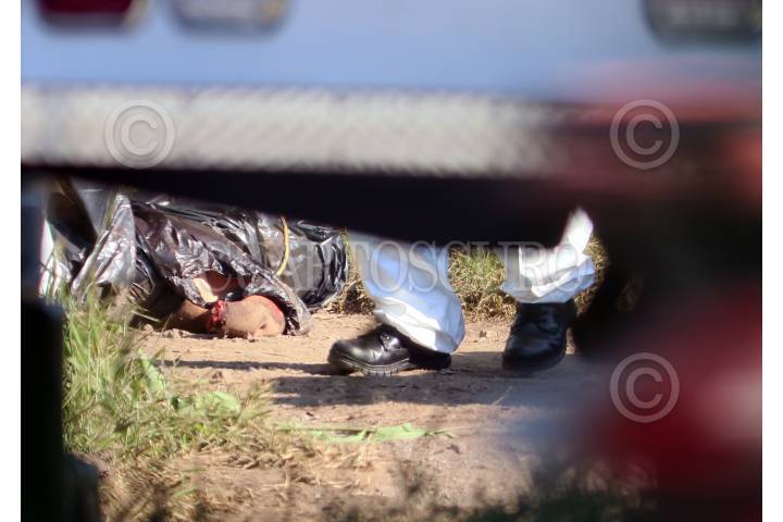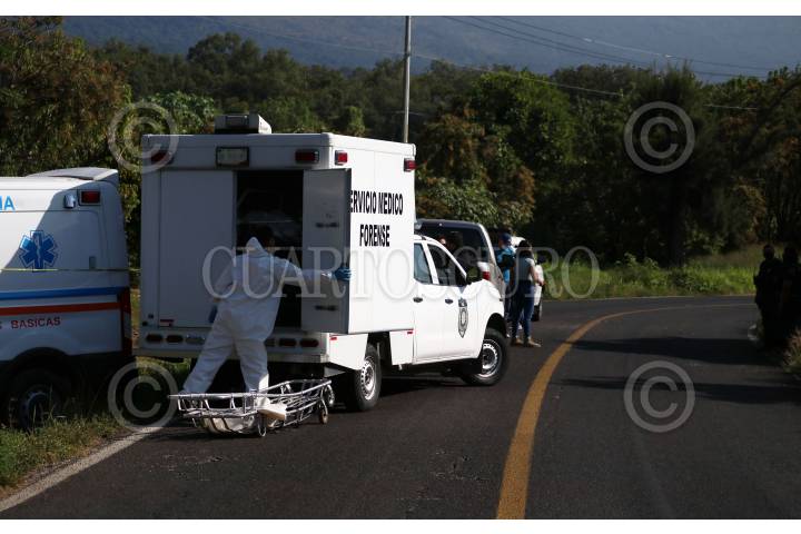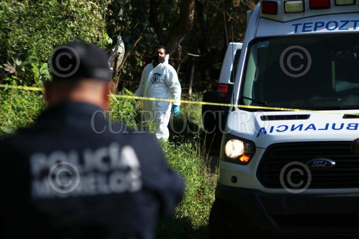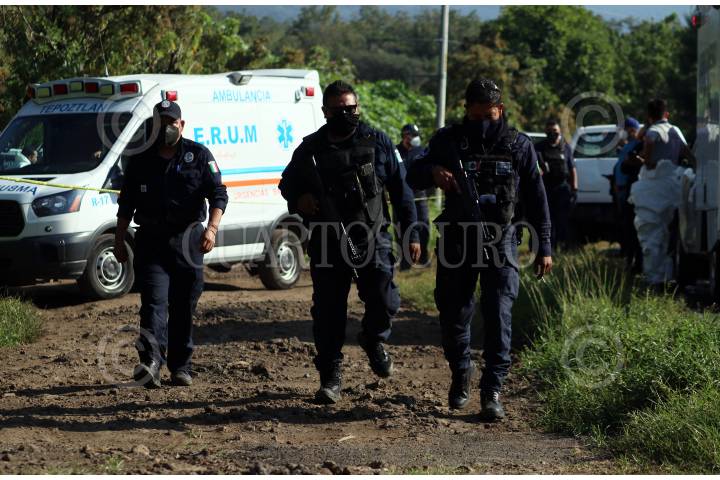 Policías de Tepoztlán resguardan un sitio donde se localizaron dos cadáveres sin la extremidad cefálica.