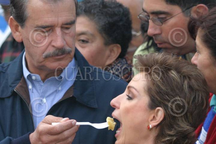 MEXICO, D.F. 02FEBRERO2005.- Marta Sahagún comió un trozo de tamal de la mano de su esposo el presidente Vicente Fox, durante el festejo del ¨Dìa de la Calendaria¨, en las instalaciones de Liconsa. FOTO: Sandra Perdomo/CUARTOSCURO.COM