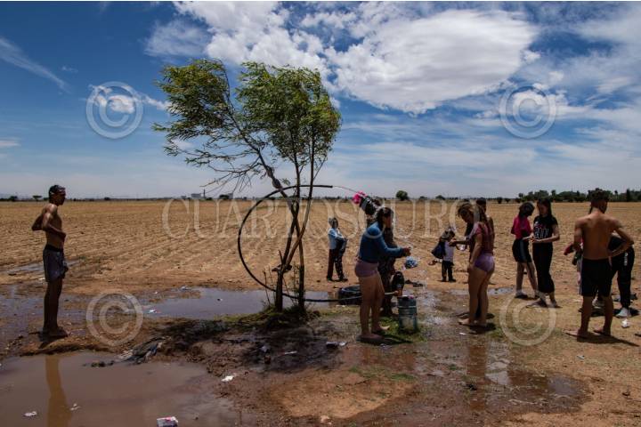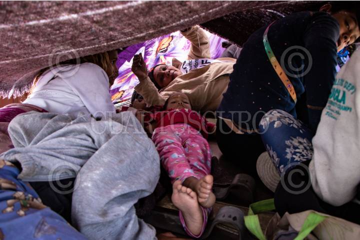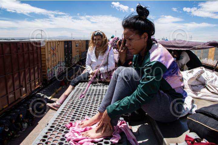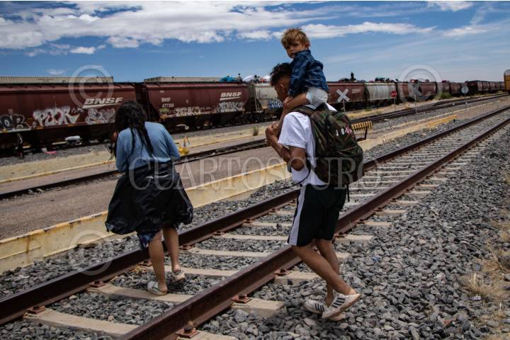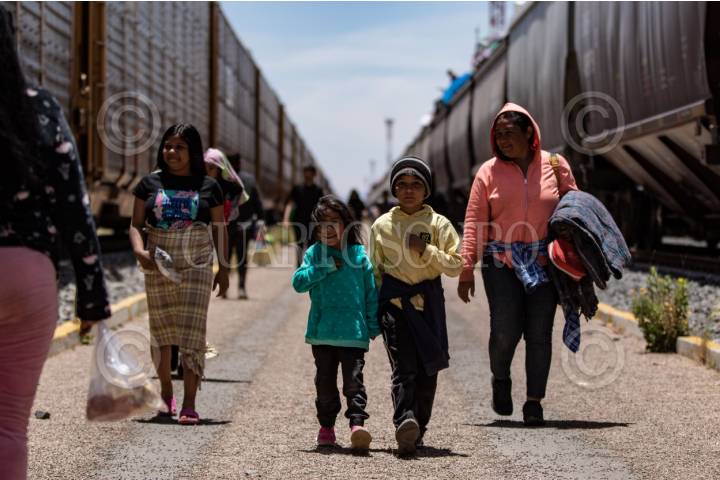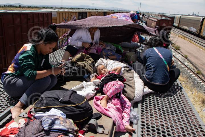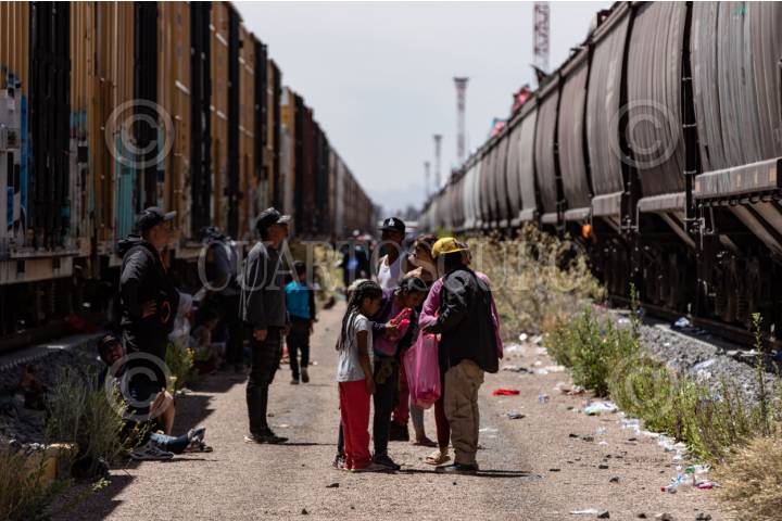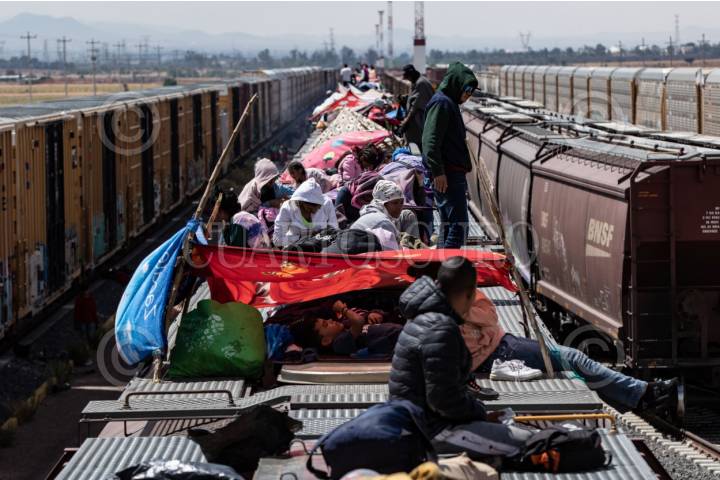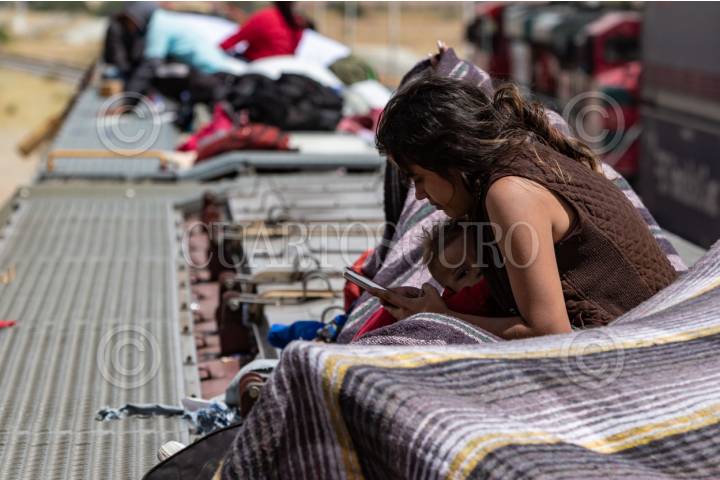 ENRIQUE ESTRADA, ZACATECAS, 02MAYO2024.- Alrededor de mil quinientos migrantes, entre niños, mujeres y hombres de diferentes países como Venezuela, Colombia, Ecuador y Centroamérica; quedaron varados a la altura de la comunidad de Ramón López Velarde. Los migrantes viajaban en dos trenes, el primero montado por aproximadamente 300 personas paró en el lugar desde el medio día de ayer; y esta mañana, muy temprano, llegó otro con arriba de mil personas, por lo que se integraron en uno solo y sin saber cuando continuarían con el recorrido al norte del país. En sus estancia en el lugar, personas de grupos solidarios llevaron alimentos, medicinas y agua; además de que los ejidatarios de la zona abrieron los pozos para que algunos pudieran asearse en la espera. Desde el día de ayer, a la entrada de la zona conurvada, Guadalupe-Zacatecas, se instaló una "unidad de migración" por parte del Instituto Nacional de Migración; esta mañana en ese lugar se intentó bajar a la fuerza las personas que iban montados en La Bestia, aunque lograron permanecer en la misma, varios de ellos fueron golpeados por elementos del INM. FOTO: ADOLFO VLADIMIR /CUARTOSCURO.COM