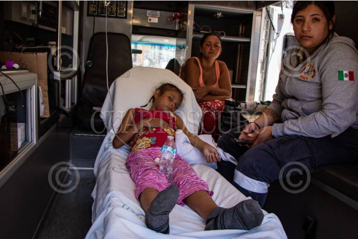 ENRIQUE ESTRADA, ZACATECAS, 02MAYO2024.- Alrededor de mil quinientos migrantes, entre niños, mujeres y hombres de diferentes países como Venezuela, Colombia, Ecuador y Centroamérica; quedaron varados a la altura de la comunidad de Ramón López Velarde. Los migrantes viajaban en dos trenes, el primero montado por aproximadamente 300 personas paró en el lugar desde el medio día de ayer; y esta mañana, muy temprano, llegó otro con arriba de mil personas, por lo que se integraron en uno solo y sin saber cuando continuarían con el recorrido al norte del país. En sus estancia en el lugar, personas de grupos solidarios llevaron alimentos, medicinas y agua; además de que los ejidatarios de la zona abrieron los pozos para que algunos pudieran asearse en la espera. Desde el día de ayer, a la entrada de la zona conurvada, Guadalupe-Zacatecas, se instaló una "unidad de migración" por parte del Instituto Nacional de Migración; esta mañana en ese lugar se intentó bajar a la fuerza las personas que iban montados en La Bestia, aunque lograron permanecer en la misma, varios de ellos fueron golpeados por elementos del INM. En la imagen, pequeña es atendida por un problema en los niveles de azúcar, paramédicos de Protección Civil municipal. FOTO: ADOLFO VLADIMIR /CUARTOSCURO.COM