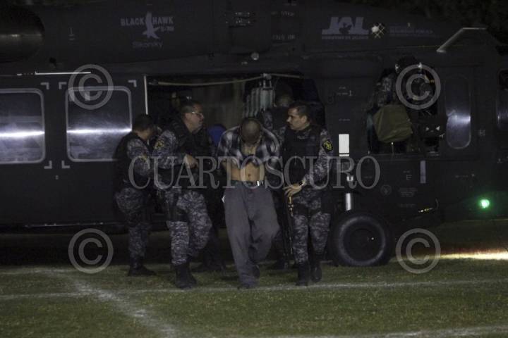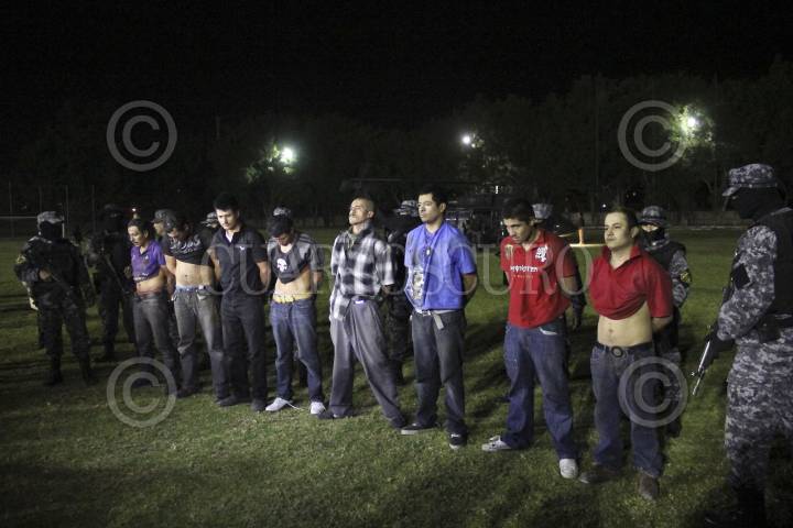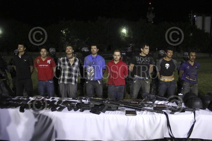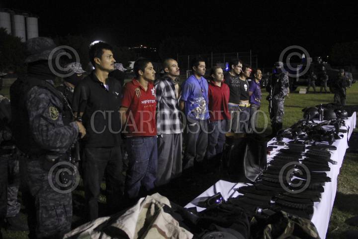 GUADALAJARA, JALISCO, 30ENERO2013.- La noche de ayer en las instalaciones de la Secretaria de Seguridad Publica del Estado, fueron presentadas ocho personas detenidas en Hostotipaquillo, dos de ellas presuntamente relacionadas con el asesinato del Director de la Policía de dicho municipio, Lucio Rosales Astorga y a los otros seis individuos se les señala como presuntos halcones, a los mismos se les decomisaron armas de alto poder entre las que se encuentran, una calibre .50, así como cascos, chalecos antibalas, granadas, celulares, además de cuatro vehículos, todos con reporte de robo. FOTO: CUARTOSCURO.COM