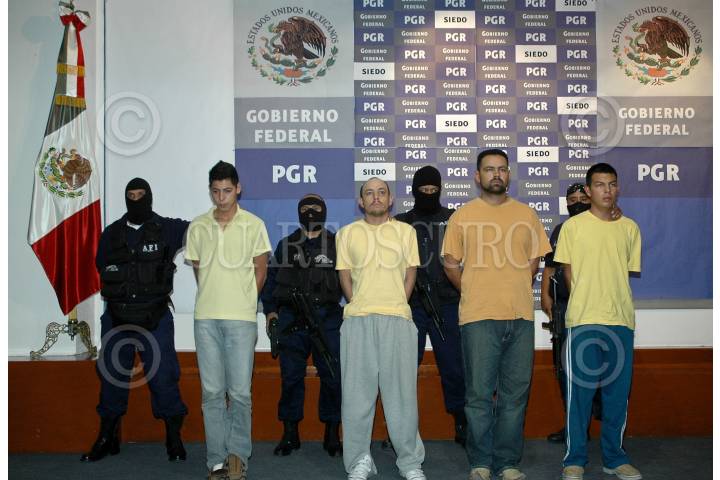 MÉXICO, D.F., 05ABRIL2009.- Jesús Avelino Mendoza, Iván Martínez Portillo, David Alejandro Moreno y Gabino Millón Estrada, fueron presentados en la SIEDO como presuntos sicarios relacionados con el atentado a los escoltas del gobernador de Chihuahua el pasado 22 de febrero; fueron detenidos por elementos de la Policía Federal en posesión de armas de fuego de grueso calibre. FOTO: RODOLFO ANGULO/CUARTOSCURO.COM