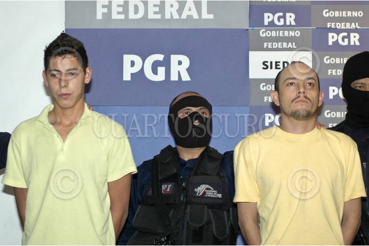 MÉXICO, D.F., 05ABRIL2009.- Jesús Avelino Mendoza, Iván Martínez Portillo fueron presentados en la SIEDO como presuntos sicarios relacionados con el atentado a los escoltas del gobernador de Chihuahua el pasado 22 de febrero; fueron detenidos por elementos de la Policía Federal en posesión de armas de fuego de grueso calibre. FOTO: RODOLFO ANGULO/CUARTOSCURO.COM