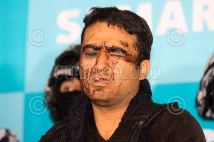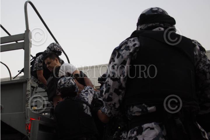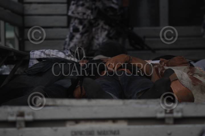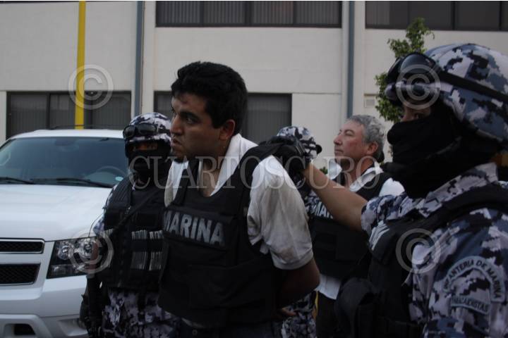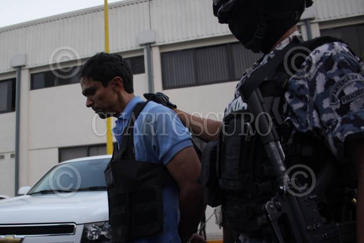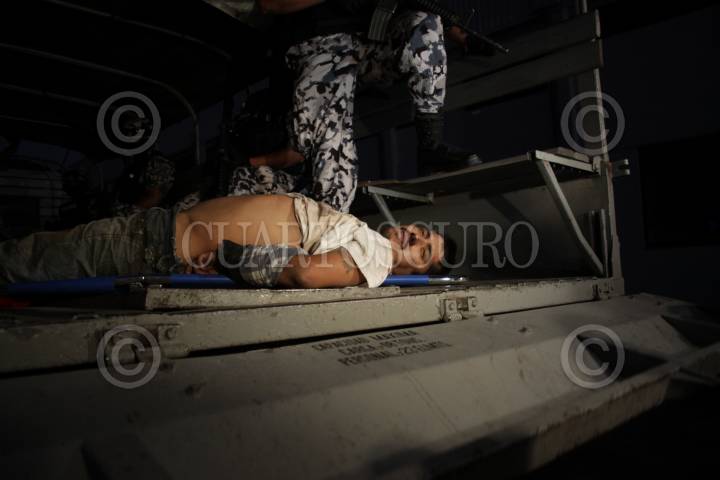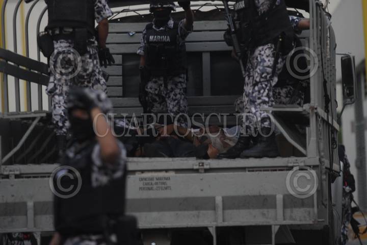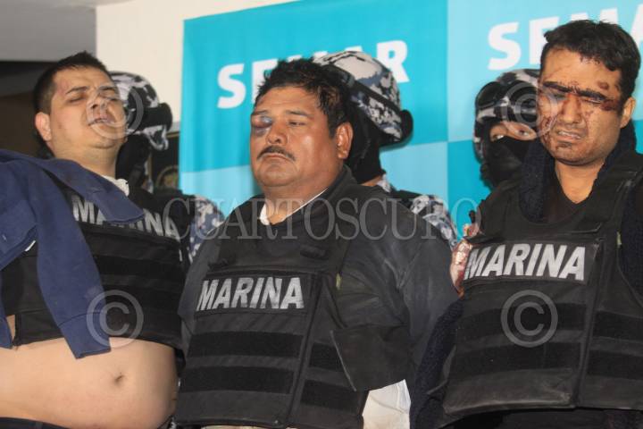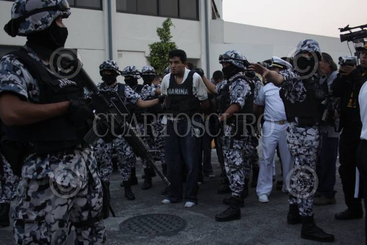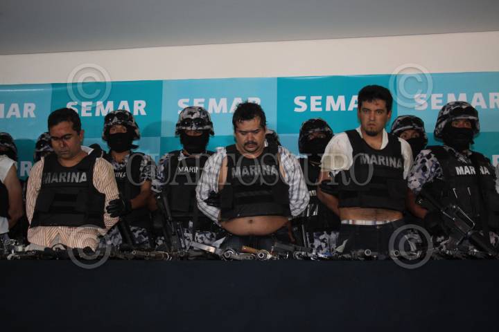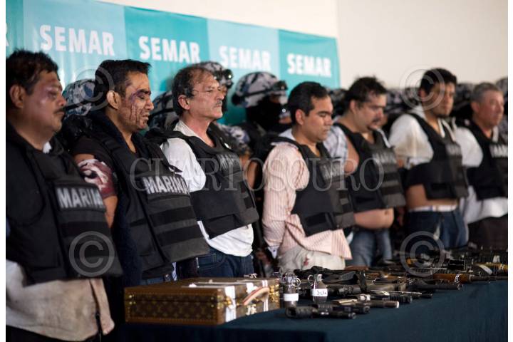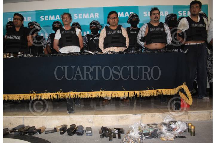 MÉXICO, D.F., 11DICIEMBRE2009.- Personal de Infantería de la Marina Armada de México presento a 11 presuntos sicarios de los Beltrán Leyva después de un enfrentamiento el día de ayer en Tepoztlán, Morelos, en el que perdieron la vida tres presuntos delicuentes,se aseguraron 280 mil 700 dólares en efectivo, 16 armas largas y 4 cortas, así como 1700 municiones de diversos calibres y 74 cargadores. FOTO: SÁSHENKA GUTIÉRREZ/CUARTOSCURO.COM