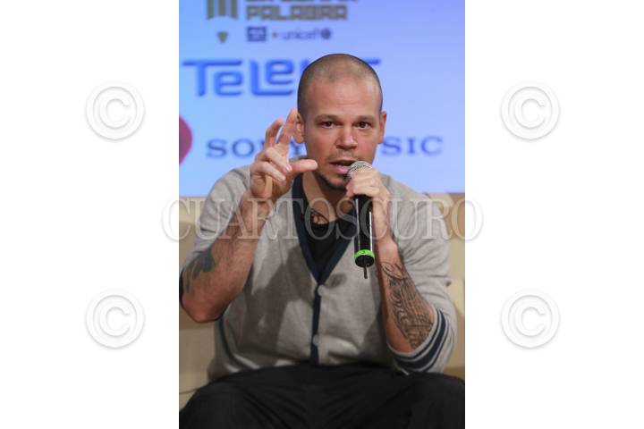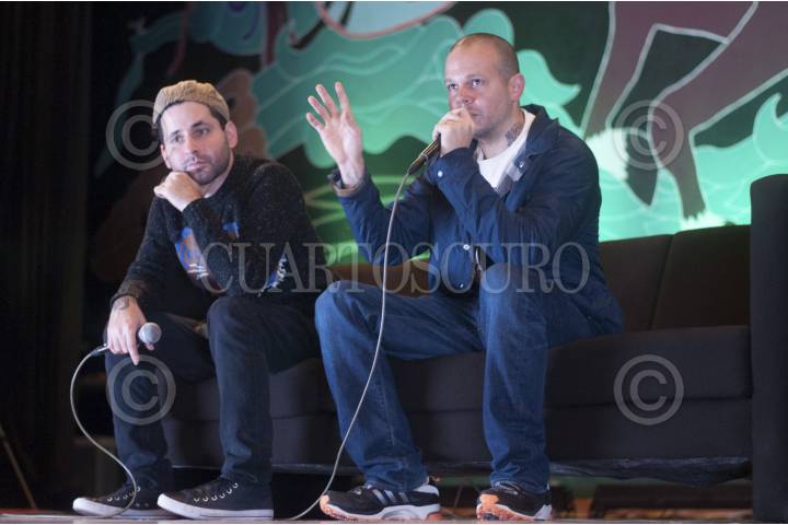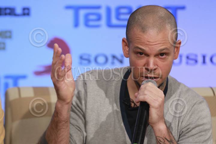 MÉXICO, D.F., 01ABRIL2014.- El grupo puertoriqueño Calle 13, integrado por René Pérez Joglar "Residente" y Eduardo Cabra "Visitante" presentó su nuevo álbum titulado Multiviral, en el Auditorio Ricardo Flores Magón de la Facultad de Ciencias Políticas y Sociales de la UNAM. El disco contiene canciones grabadas con Eduardo Galeano, Julian Assange, Silvio Rodríguez y Tom Morello. FOTO: DIEGO SIMÓN SÁNCHEZ /CUARTOSCURO.COM