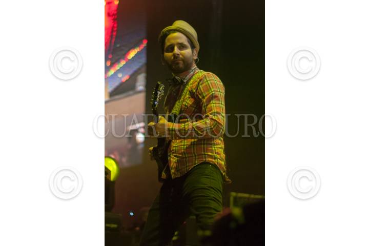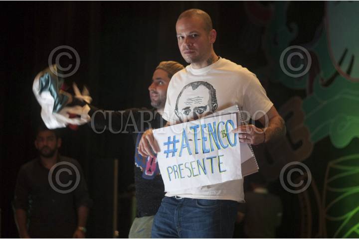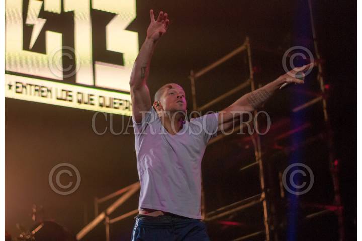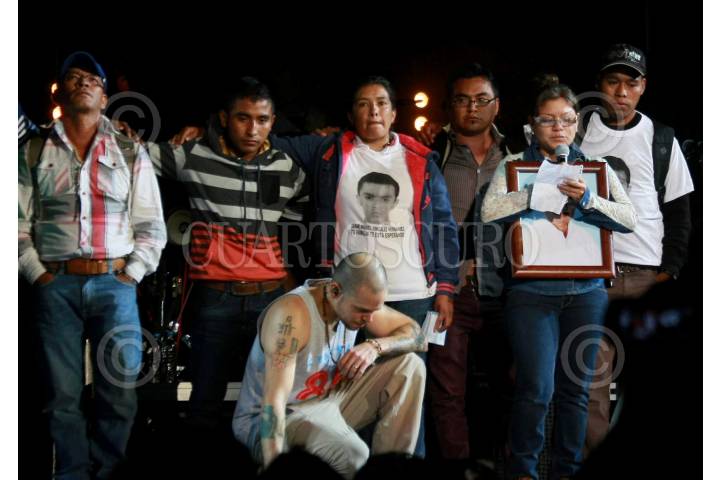 MÉXICO, D.F., 22NOVIEMBRE2014.- La agrupación Calle 13 ofreció un concierto en el Palacio de Bellas Artes, tras interpretar el tema Multi Viral (del disco del mismo nombre) acompañados del guitarrista Tom Morello (reconocido con la banda Rage Against the Machine) René Pérez Residente, subió al escenario a algunos padres de los estudiantes desaparecidos de Ayotzinapa, a los cuales dio el micrófono para que expresaran su sentir. Los asistentes se unieron al grito unísono de “no están solos”, en este clamor nacional por que los 43 estudiantes normalistas de Ayotzinapa aparezcan con vida. FOTO: CUARTOSCURO.COM
