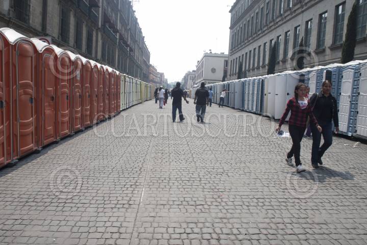 MÉXICO, D.F., 10MAYO2012.- Cientos de retretes portátiles fueron colocados en las inmediaciones del Zócalo capitalino ante el arribo de cientos de personas que disfrutaran por la noche el conicerto del Paul Mccartney. FOTO: FRANCISCO RODRÍGUEZ /CUARTOSCURO.COM