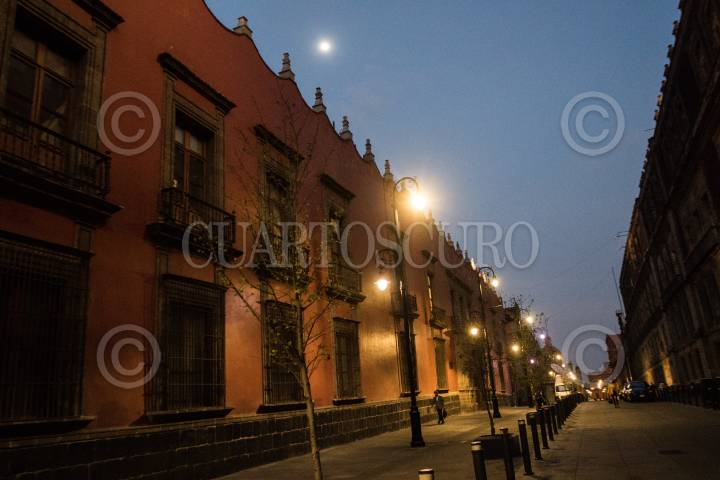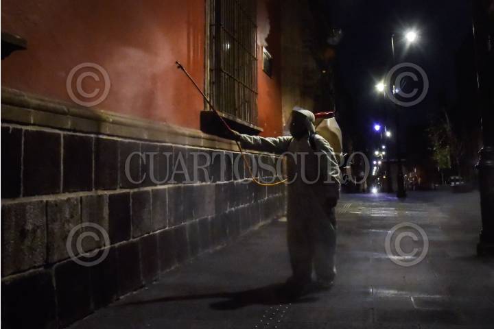 Un trabajador realiza desinfección sobre la calle de Moneda en el Centro Histórico.