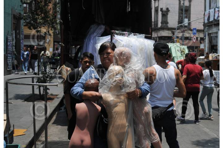 CIUDAD DE MÉXICO, 08MAYO2024. - Decenas de maniquíes fueron colocados sobre la banqueta luego de que los negocios fueran desalojados. FOTO: DANIEL AUGUSTO /CUARTOSCURO.COM
