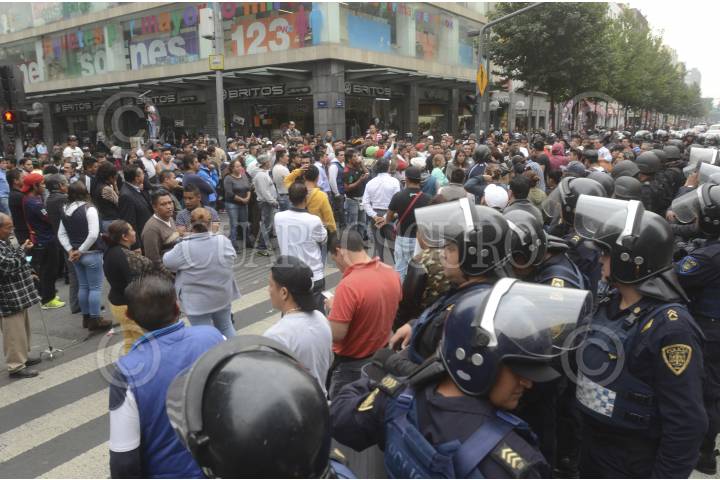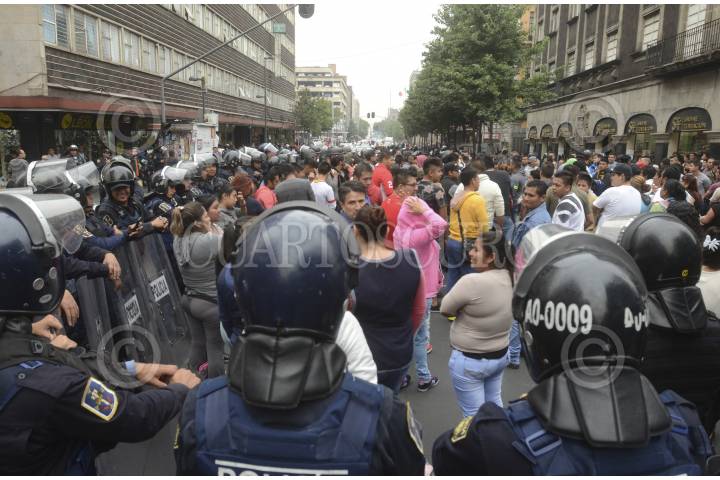 CIUDAD DE MÉXICO, 17NOVIEMBRE2016.- Comerciantes ambulantes de la calle de Mesones, en el Centro Histórico, protestaron porque no los dejaron vender sobre la vía pública. Los inconformes bloquearon a avenida Pino Suárez, pero granaderos se los impidieron colocando una valla humana. FOTO: ARMANDO MONROY /CUARTOSCURO.COM