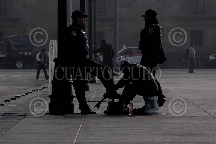 CIUDAD DE MÉXICO, 23ENERO2018.- Un bolero limpia las botas de un policía en el Zócalo capitalino. FOTO: TERCERO DÍAZ /CUARTOSCURO.COM