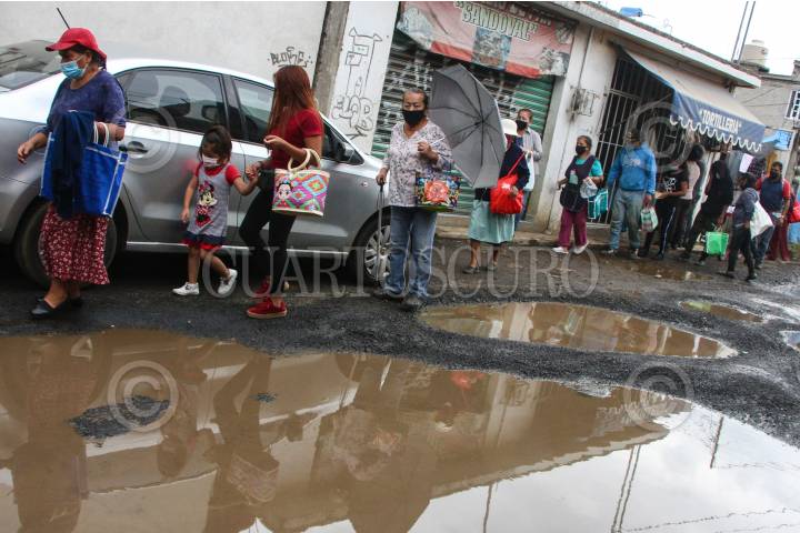 Vecinos del Pueblo de San Luis Tlaxialtemalco, realizan una fila para poder cruzar la calle sin caer en el agua.