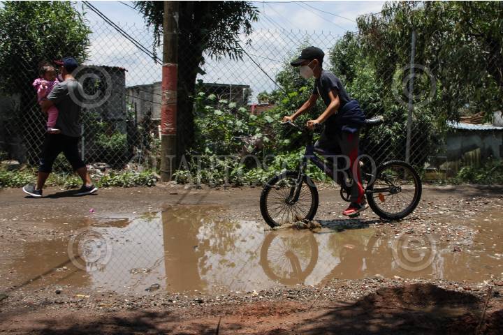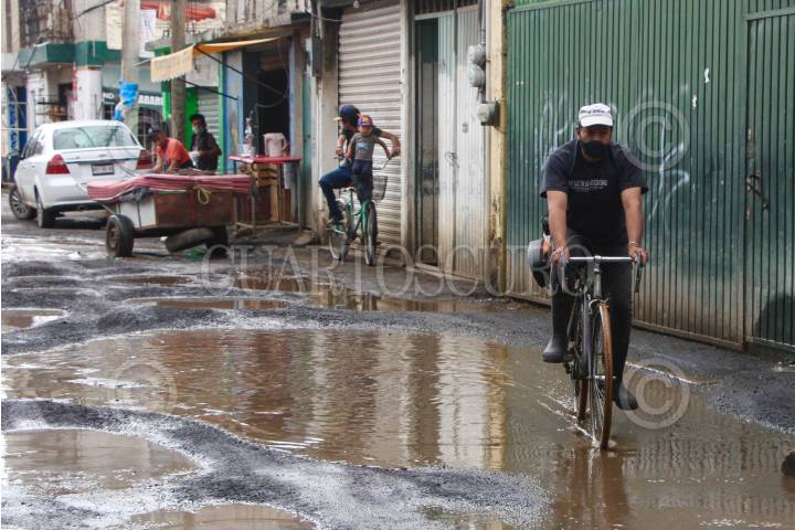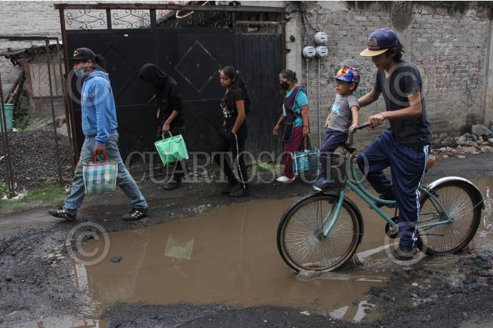 Un niño cruza en bicicleta un bache repleto de agua en las calles del Pueblo de San Luis Tlaxialtemalco.