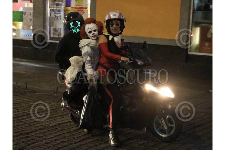 CIUDAD DE MÉXICO, 03NOVIEMBRE.- En el marco de la celebración de Día de Muertos aún se puede ver a familias caracterizadas en las calles de la ciudad. En imagen una madre y sus dos hijos pasean arriba de una motoneta. FOTO: ROGELIO MORALES /CUARTOSCURO.COM