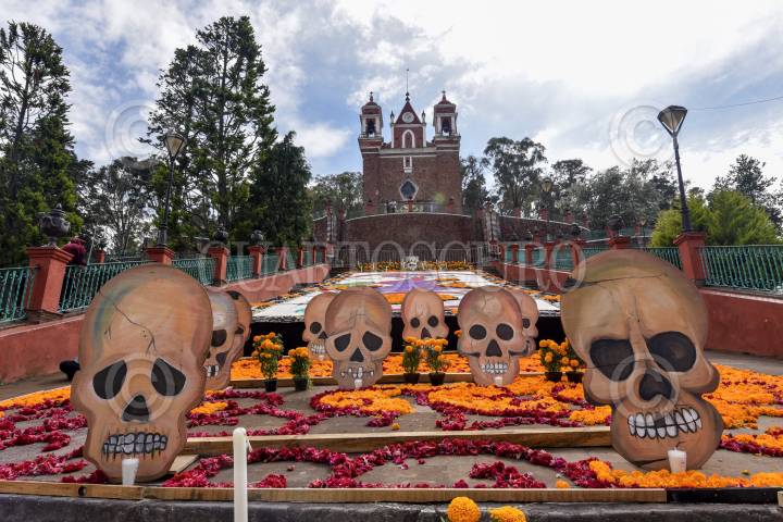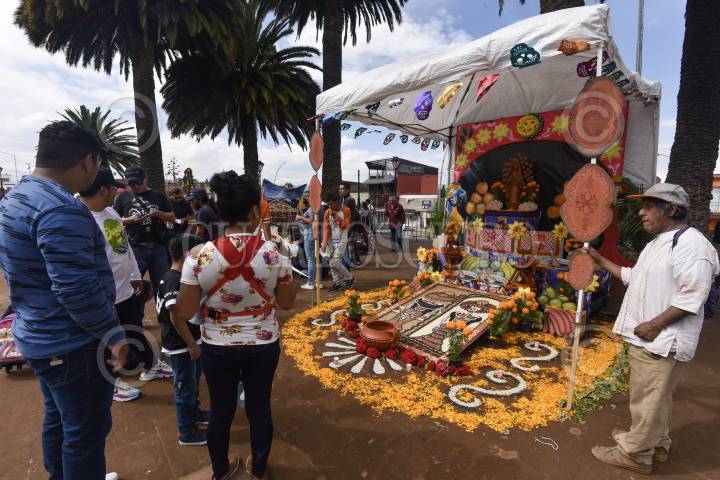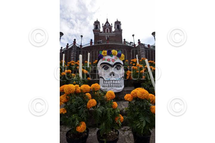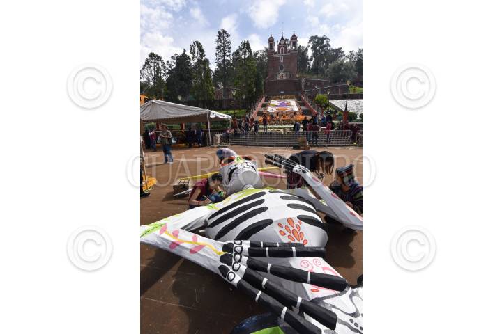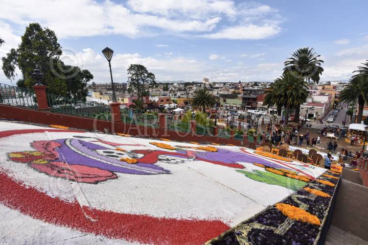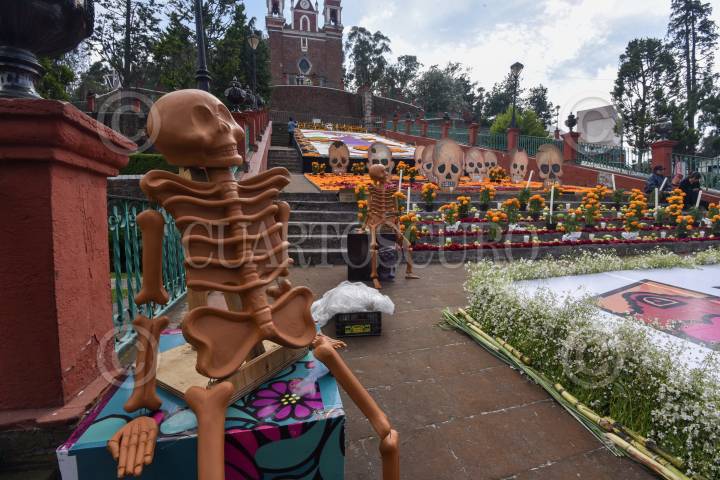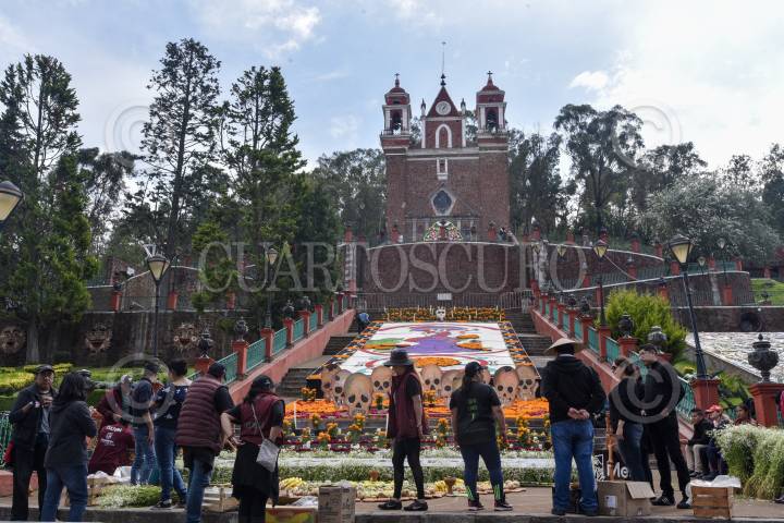 METEPEC, ESTADO DE MÉXICO, 31OCTUBRE2019.- Como parte de la celebración del Día de Muertos fue instalada la Mega Ofrenda que comprende de un tapete de una catrina gigante, flores, velas, cráneos de barro y de cartonería instalados en las escalinatas del Calvario, a los costados fueron instaladas ofrendas individuales. FOTO: CRISANTA ESPINOSA AGUILAR /CUARTOSCURO.COM