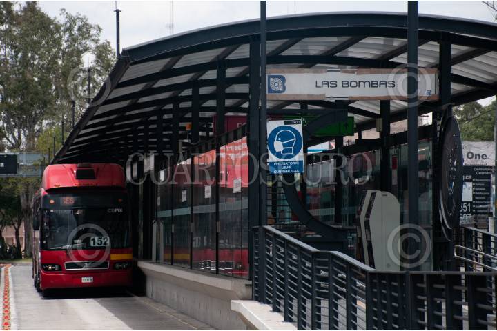 Autobús articulado realiza una prueba en la estación Las Bombas de la ampliación de la Línea 5 del Metrobús.