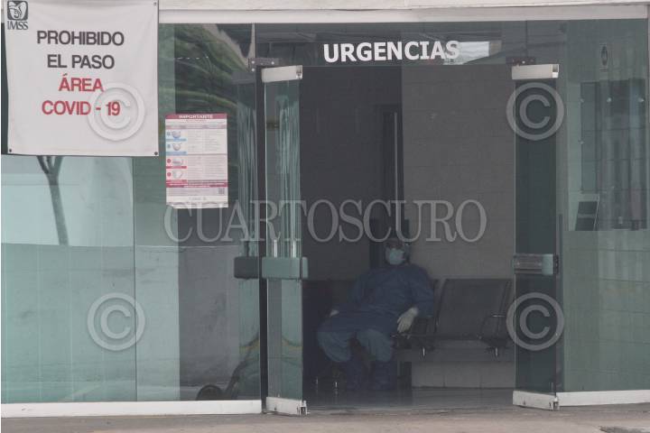 Doctor descansa en las bancas del área de urgencias para la atención de COVID-19.