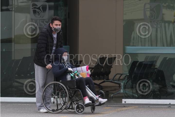 Mujer empuja silla de ruedas con paciente, frente al área de urgencias del Hospital Regional Número 2.