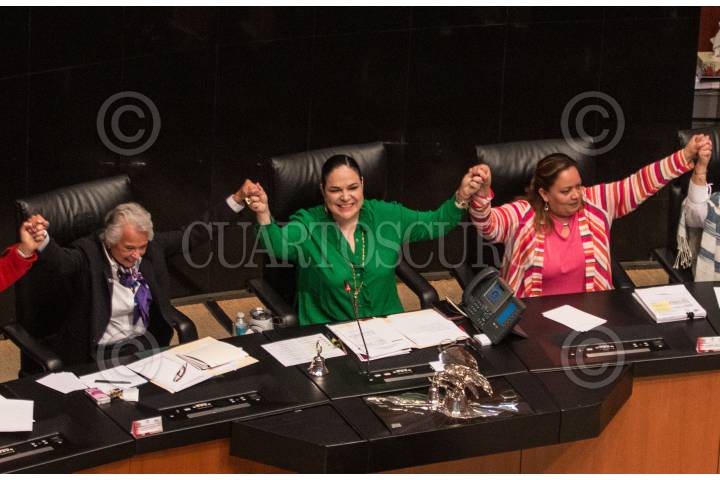 CIUDAD DE MÉXICO, 26SEPTIEMBRE2019.- La secretaria de Gobernación, Olga Sánchez Cordero; la presidenta de la Cámara de Senadores, Mónica Fernández Balboa y senadoras, se tomaron de las manos celebrando el avance de las mujeres ante puestos importantes en el Senado y Gobernación. FOTO: ANDREA MURCIA /CUARTOSCURO.COM