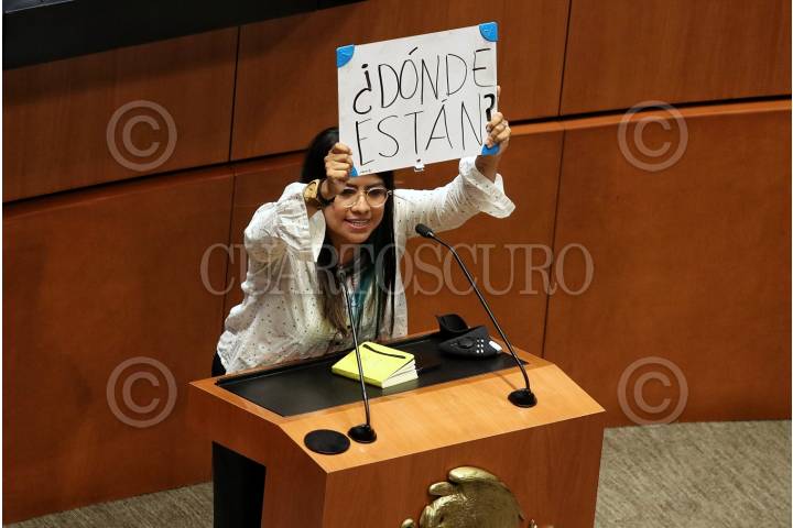 La senadora Erendira Martínez durante la sesión Ordinaria en la cámara de senadores donde sacó una pancarta en protesta por los miles de desaparecidos en el país