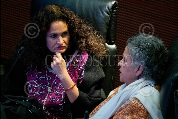 CIUDAD DE MÉXICO, 05DICIEMBRE2023.- La senadora morenista Susana Harp conversa con la priista Beatriz Paredes durante la sesión ordinaria de la LXV Legislatura en la Cámara de Senadores. FOTO: GALO CAÑAS/CUARTOSCURO.COM