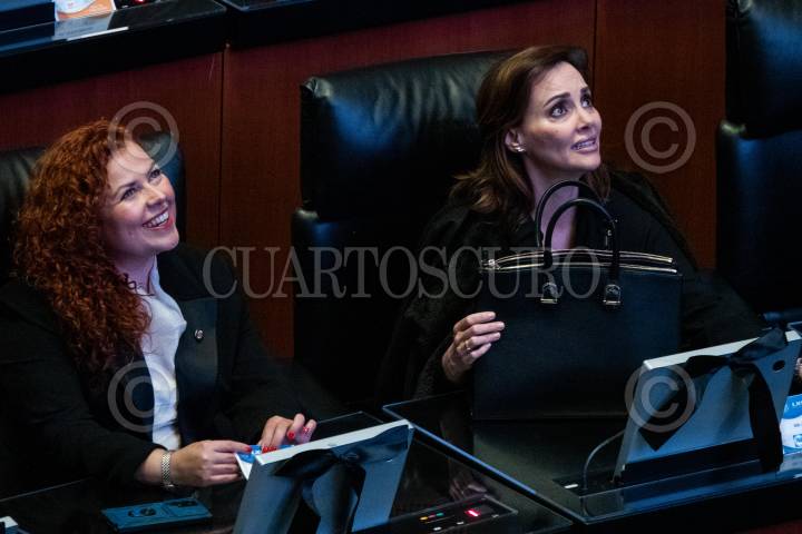 CIUDAD DE MÉXICO, 05DICIEMBRE2023.- Las panistas Yadhira Yvette Tamayo Herrera, senadora suplente de su compañera Kenia López Rabadán, y Lily Téllez durante la sesión ordinaria de la LXV Legislatura en la Cámara de Senadores. FOTO: GALO CAÑAS/CUARTOSCURO.COM