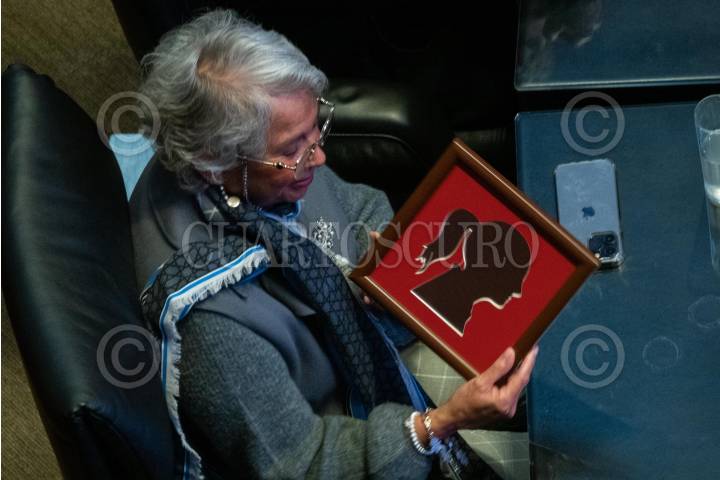 CIUDAD DE MÉXICO, 05DICIEMBRE2023.- La senadora morenista Olga Sánchez Cordero muestra un espejo con la silueta de Claudia Sheinbaum durante la sesión ordinaria de la LXV Legislatura en la Cámara de Senadores. FOTO: GALO CAÑAS/CUARTOSCURO.COM