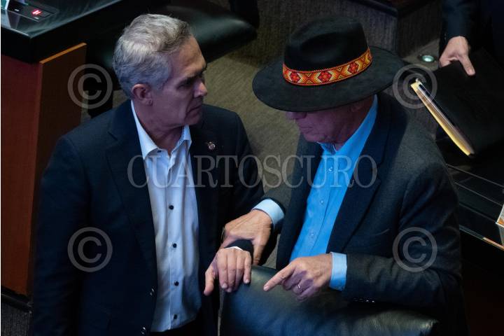 CIUDAD DE MÉXICO, 05DICIEMBRE2023.- El perredista Miguel Ángel Mancera conversa con el coordinador de Movimiento Ciudadano, Dante Delgado, durante la sesión ordinaria de la LXV Legislatura en la Cámara de Senadores. FOTO: GALO CAÑAS/CUARTOSCURO.COM