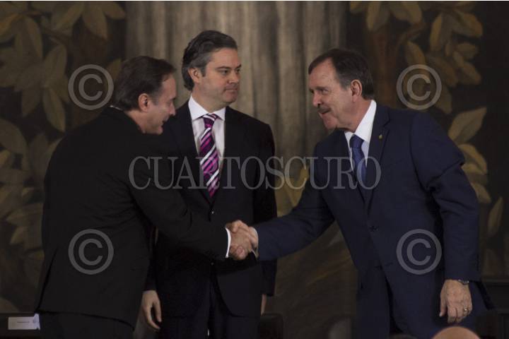 CIUDAD DE MÉXICO, 29AGOSTO2016.- Aurelio NUño Mayer, secretario de Educación Pública (SEP), Javier Treviño Cantú, subsecretario de Educación Básica de SEP, y Enrique Solana Sentíes, presidente de la Concanaco Servytur, durante el foro de consulta sobre Modelo Educativo y Propuesta Curricular para la Educación Obligatoria con Cámaras Empresariales, en la sede de la SEP. FOTO: MOISÉS PABLO /CUARTOSCURO.COM