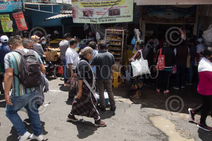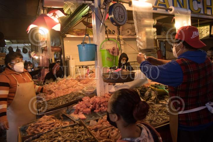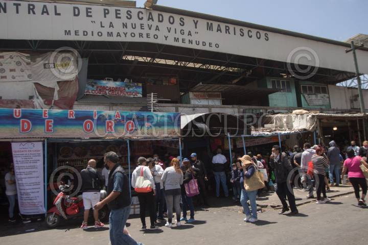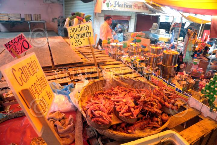 Venta de todo de tipo de alimentos del mar y a precios bajos, en el mercado la Nueva Viga de la Colonia Tránsito de la alcaldía Venustiano Carranza.