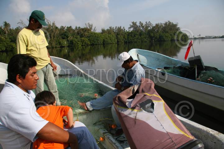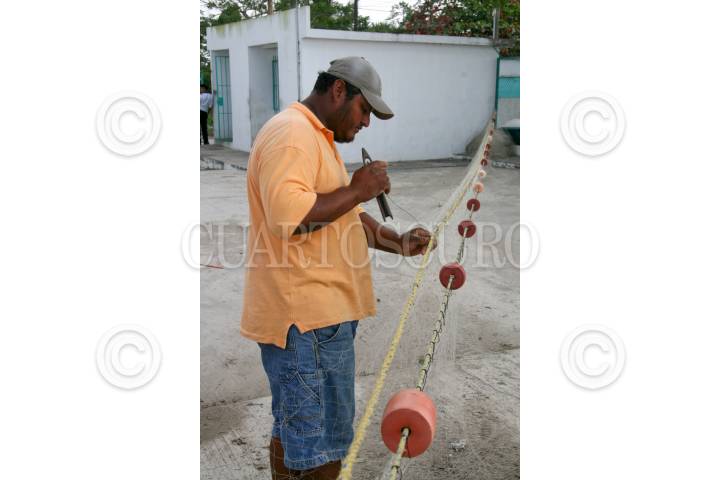 PARAISO, TABASCO, 08ENERO2009.- Pescadores de camarones en pequeñas barcazas pertenecientes a la cooperativa de Puerto Ceiba mantienen varadas sus medios de trabajo debido al alto precio del combustible disel. Aquí estos pequeños empresarios aprovechan la ocasión para tejer sus redes y revelan que se avecina una gran crisis económica para el sector pesquero tabasqueño. FOTO: MARCO POLO GUZMÁN HERNÁNDEZ/CUARTOSCURO.COM