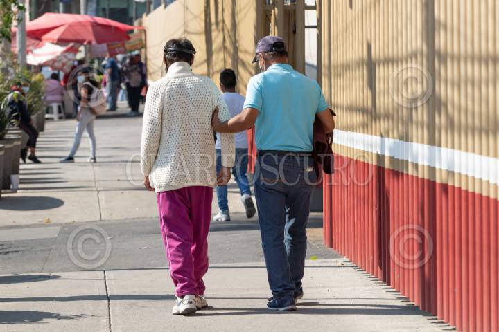 Una persona con un tanque de oxígeno médico es acompañada por un familiar previo a ser evaluado en la zona Triage Covid-19 del Hospital General de México.
