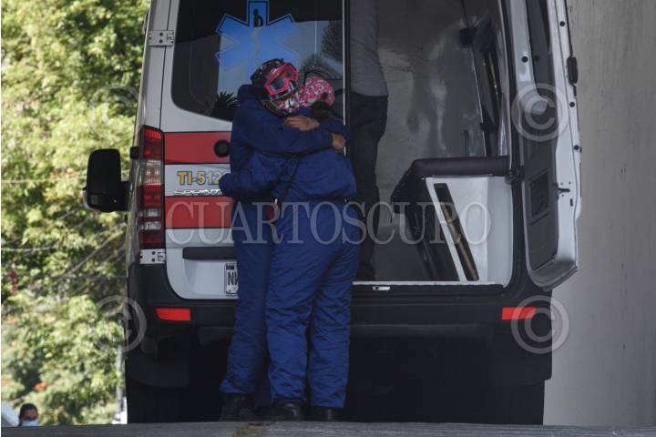 Dos paramédicos se abrazan después de haber realizado un traslado de un paciente con síntomas de covid-19 en el Hospital Rodolfo Antonio de Mucha.