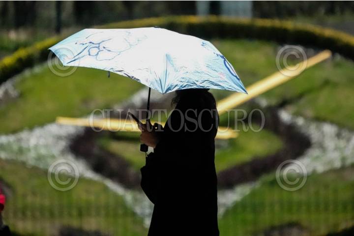 CIUDAD DE MÉXICO, 11JUNIO2024.- Una mujer se cubre completamente el rostro con su paraguas durante la calurosa tarde del martes. La capital del país registró una máxima de 29 grados centígrados y en días próximos podría superar los 30 grados. FOTO: GALO CAÑAS/CUARTOSCURO.COM