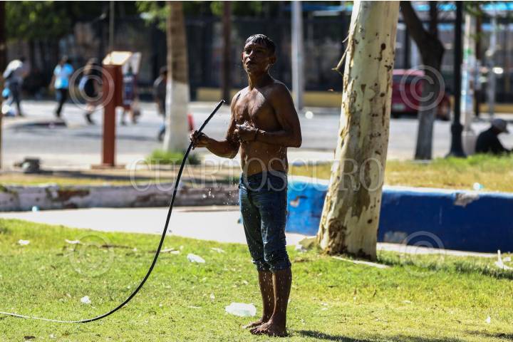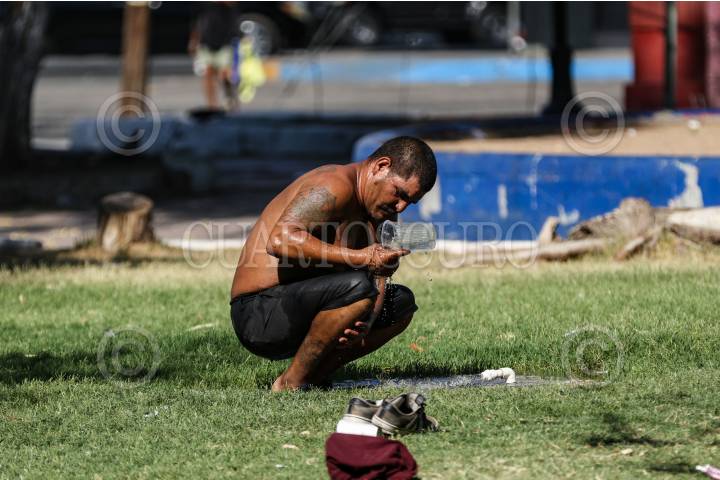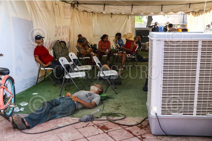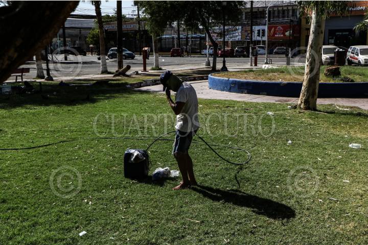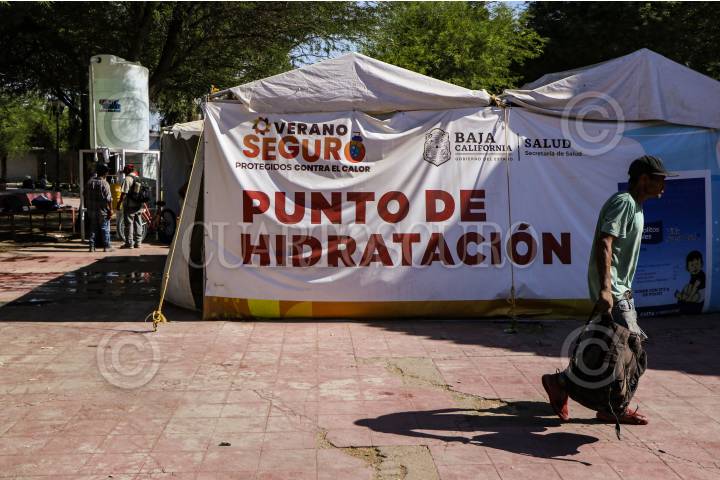 MEXICALI, BAJA CALIFORNIA, 09JULIO2024.- Estos días la ciudad fronteriza ha alcanzado las temperaturas más altas del país, rompiendo el record de 51.3 grados; los últimos días oscilan entre los 48 y 49 grados. Esto ha provocado que al menos 12 personas hayan fallecido por golpes de calor en lo que va de la temporada, tres de ellos jornaleros agrícolas que se encontraban trabajando en el valle de Mexicali; el año pasado se registraron 43 muertes relacionadas con las altas temperaturas. La Secretaría de Salud del Estado instaló distintos puntos de hidratación en la capital para que personas, fundamentalmente en situación de calle o migrantes varados, puedan descansar a la sombra con aire acondicionado, tomar agua o darse una ducha durante las altas temperaturas. FOTO: ADOLFO VLADIMIR /CUARTOSCURO.COM
