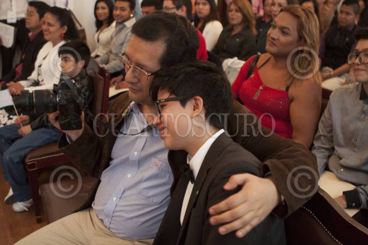 MÉXICO, D.F., 11ABRIL2015.- El joven Ángel André y su padre, durante la ceremonia en la cual se entregaron 80 actas a personas que decidieron cambiar su sexo jurídicamente, el evento se llevo a cabo en la Asamblea Legislativa del DF. Este pequeño nació biológicamente niña pero el siempre se ha sentido niño, actualmente esta en un proceso judicial para que pueda recibir su acta con su nueva personalidad. FOTO: MOISÉS PABLO /CUARTOSCURO.COM