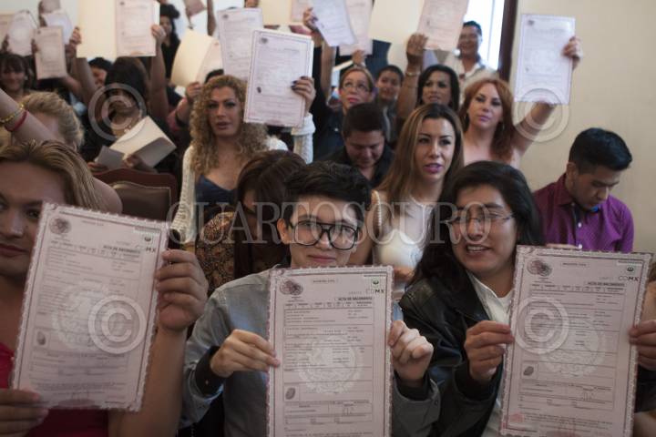 MÉXICO, D.F., 11ABRIL2015.- Cerca de 80 personas muestran sus nuevas actas tras un proceso judicial en el cual decidieron cambiar su sexo jurídicamente, la ceremonia se realizó en la ALDF. FOTO: MOISÉS PABLO /CUARTOSCURO.COM