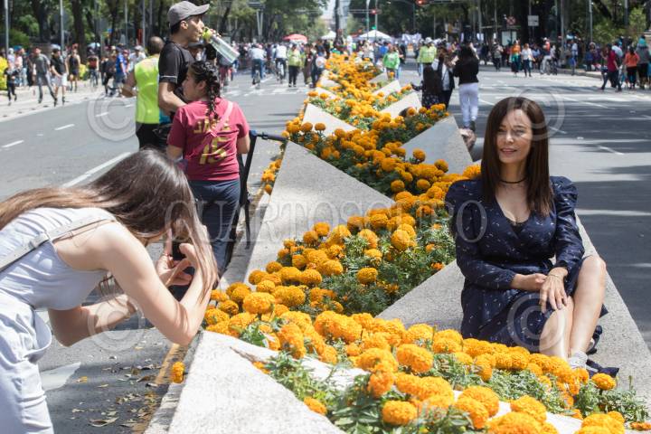 CIUDAD DE MÉXICO, 20OCTUBRE2019.- Las personas aprovechan el colorido de los camellones de avenida Reforma, en donde trabajadores del gobierno capitalino sembraron cientos de flores de cempasúchil, para tomarse una foto. FOTO: MOISÉS PABLO /CUARTOSCURO.COM