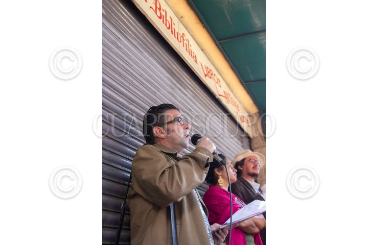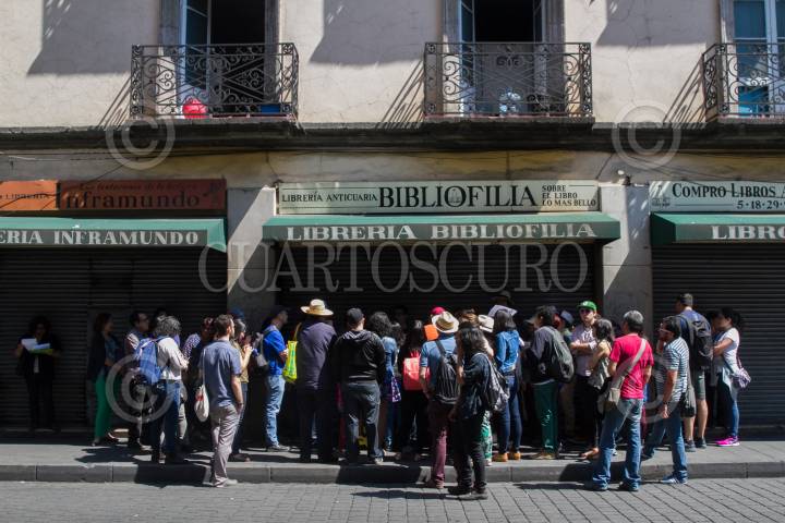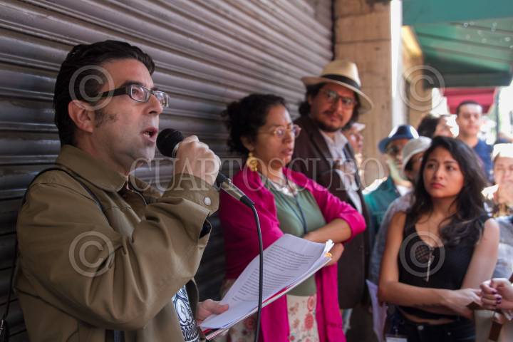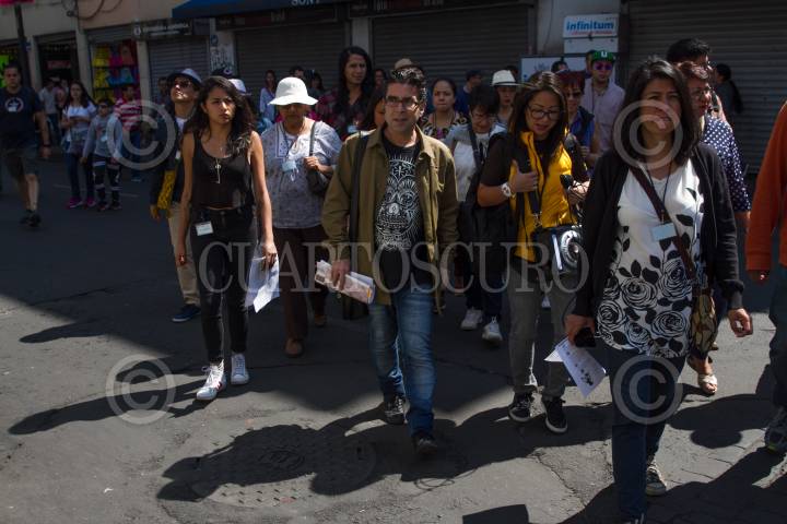 CIUDAD DE MÉXICO, 26MARZO2017.- El escritor Leonardo Tarifeño realizó una caminata literaria para visitar los sitios que en vida recorrió el escritor chileno Roberto Bolaño (1953-2003) por el centro histórico y que influyeron en sus libros, tal es el caso de "Los detectives salvajes". Los caminantes partieron de la calle de Argentina y Belisario Domínguez rumbo a la Alameda Central. FOTO: MOISÉS PABLO /CUARTOSCURO.COM