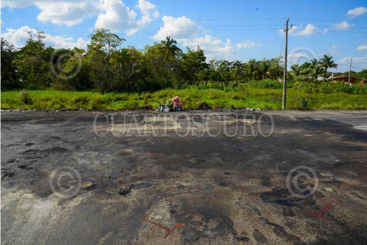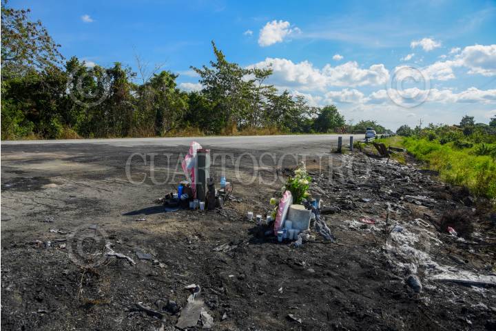 ESCÁRCEGA, CAMPECHE, 09FEBRERO2025.- Escena desolador donde ocurrió el trágico accidente en el kilómetro 170 de la carretera Escárcega-Villahermosa, donde un autobús de pasajeros y un tráiler colisionaron, dejando un saldo de 33 personas fallecidas y 9 heridas de gravedad. En el lugar del siniestro, aún se observan restos de los vehículos involucrados, así como objetos y restos de lo que seria las personas calcinadas junto a ellas veladoras y flores colocadas en memoria de las víctimas. FOTO: MICHAEL BALAM/CUARTOSCURO.COM