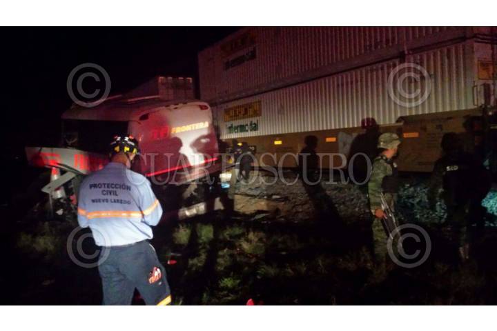 ANAHUAC, NUEVO LEÓN., 13FEBRERO2013.- 19 pasajeros de un autobús de la línea Transportes Frontera perdieron la vida luego que el chófer intentara ganar el paso del tren en las vías próximas a la estación "Camarón" a las cuatro de la tarde de ayer, ambulancias de Monterrey y Nuevo Laredo acudieron al lugar para brindar ayuda. Los lesionados fueron internados en el Hospital General de especialidades del IMSS de esta ciudad fronteriza. Elementos de la SEDENA acordonaron la zona para que peritos de la Procuraduria Estatal realizaran los peritajes correspondientes en el lugar de la tragedia. FOTO: JOAQUIN MURRIETA /CUARTOSCURO.COM