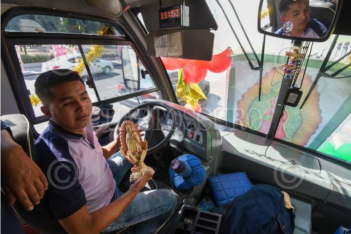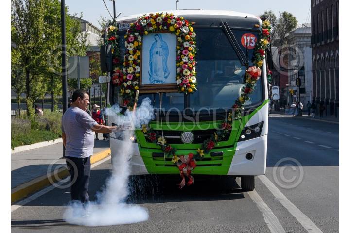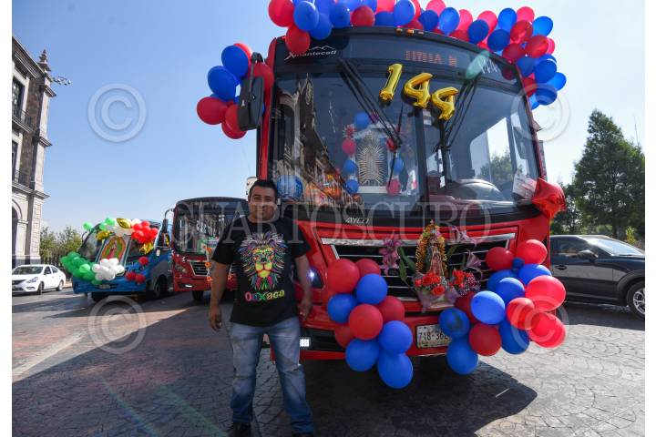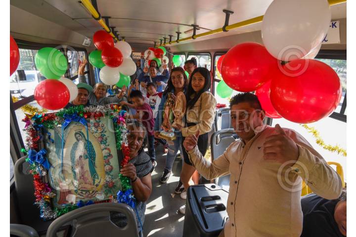 TOLUCA, ESTADO DE MÉXICO, 12DICIEMBRE2024.- Transportistas del Valle de Toluca realizaron una caravana en honor a la Virgen de Guadalupe, circularon por las principales avenidas de la capital mexiquense con sus unidades adornadas con la virgen Morena, globos, moños y obsequiando dulces a la gente que se encontraba en la calle, por algunos minutos pararon frente a Palacio de Gobierno y algunos bajaron a bailar y continuar el festejo. FOTO: CRISANTA ESPINOSA AGUILAR /CUARTOSCURO.COM