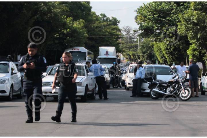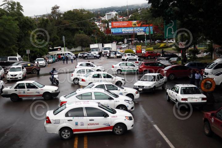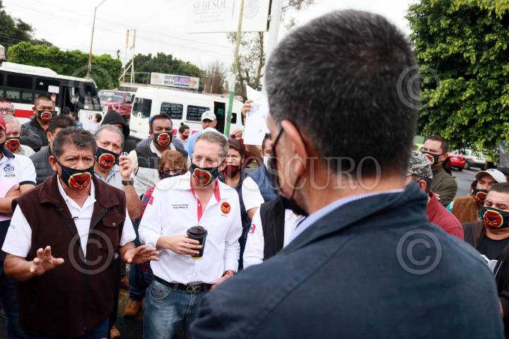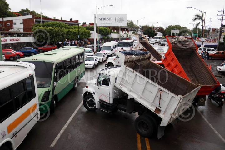 Choferes de taxis y de camiones de volteo bloquean la delegación de la Secretaria de Bienestar.