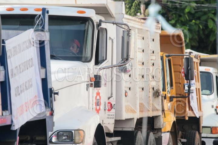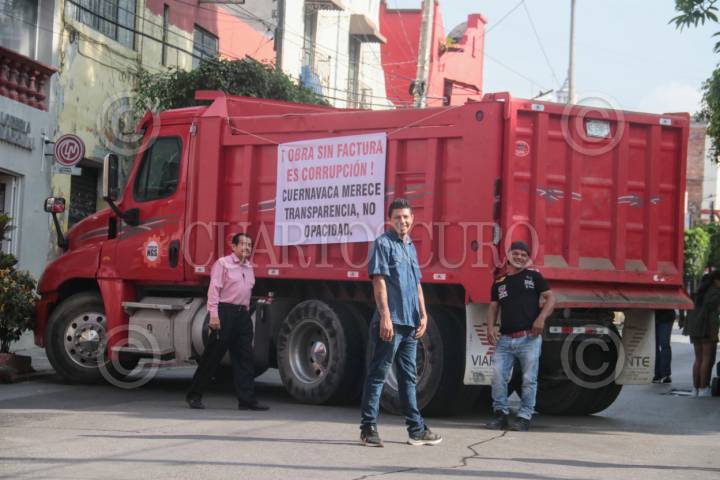 CUERNAVACA, MORELOS, 15JULIO2025.- Decenas de choferes de camiones de carga adheridos al Nuevo Grupo Sindical protestan cerrando con sus unidades varias calles que rodean en Palacio Municipal en el centro de la ciudad. Exigen al gobierno municipal transparencia en la asignación de obras, ya que desde hace meses han recibió desdén y falta de cumplimiento. La protesta genera caos vial en la ciudad. FOTO: MARGARITO PÉREZ RETANA/CUARTOSCURO. COM