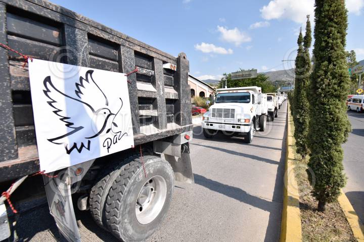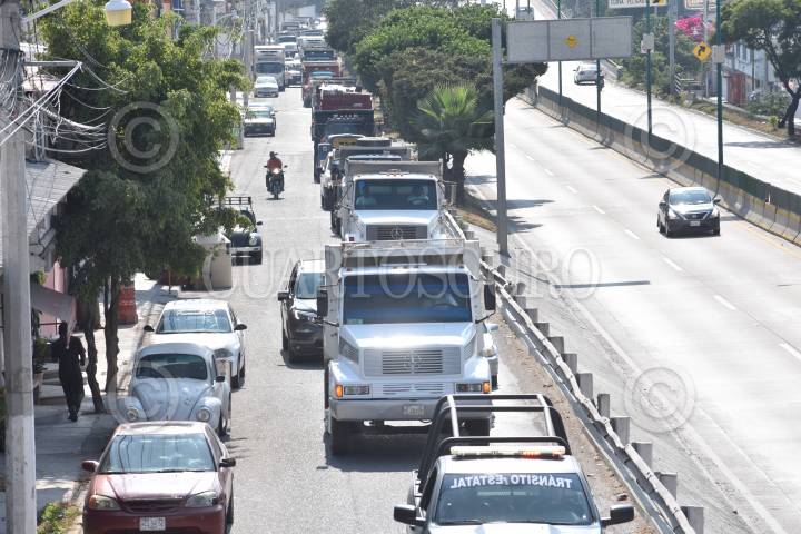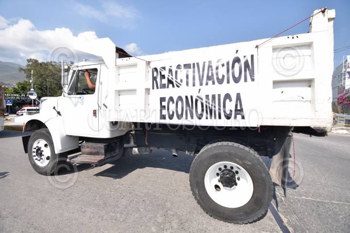 Chóferes de camiones de volteo que integran la Coalición de Transportistas de la Zona Centro realizaron una caravana para exigir al gobierno la reactivación de industria de la construcción ya que se encuentran en una profunda crisis económica tras varios meses de permanecer parados por la pandemia de Covid-19.